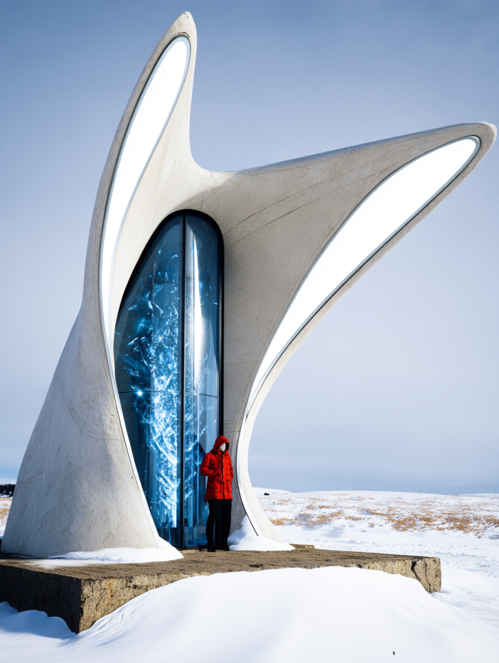 White concrete as pure as snow, pierced by a glowing blue elevator shaft that unites the underground station with its sleek polar pavilion.
